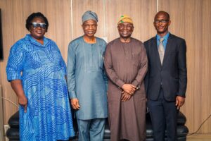 L-R: Permanent Secretary, Ministry of Education, Science and Technology, Oyo State, Mrs Oyinlola Toyin; Honourable Commissioner for Education, Science and Technology, Oyo State, Olusegun Emmanuel Olayiwola; Nigerian Maritime Administration and Safety Agency, NIMASA, Dr Dayo Mobereola, Dr.Dayo Moberola and Vice Principal, Administration, St. Patrick’s Grammer School during a visit by the NIMASA Director General to the Ministry of Education, Science and Technology in Ibadan, Oyo State.